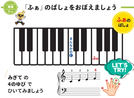 楽譜を中心としたメインの教材です。ドレミブラザーズやかわいいイラスト、丁寧な説明で、楽しく譜読みや演奏を学べます。