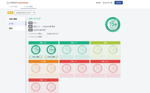 現在のレベルや、ミュージック検定の取得状況が確認でき、レッスンの成果の体感と達成感を得られます。